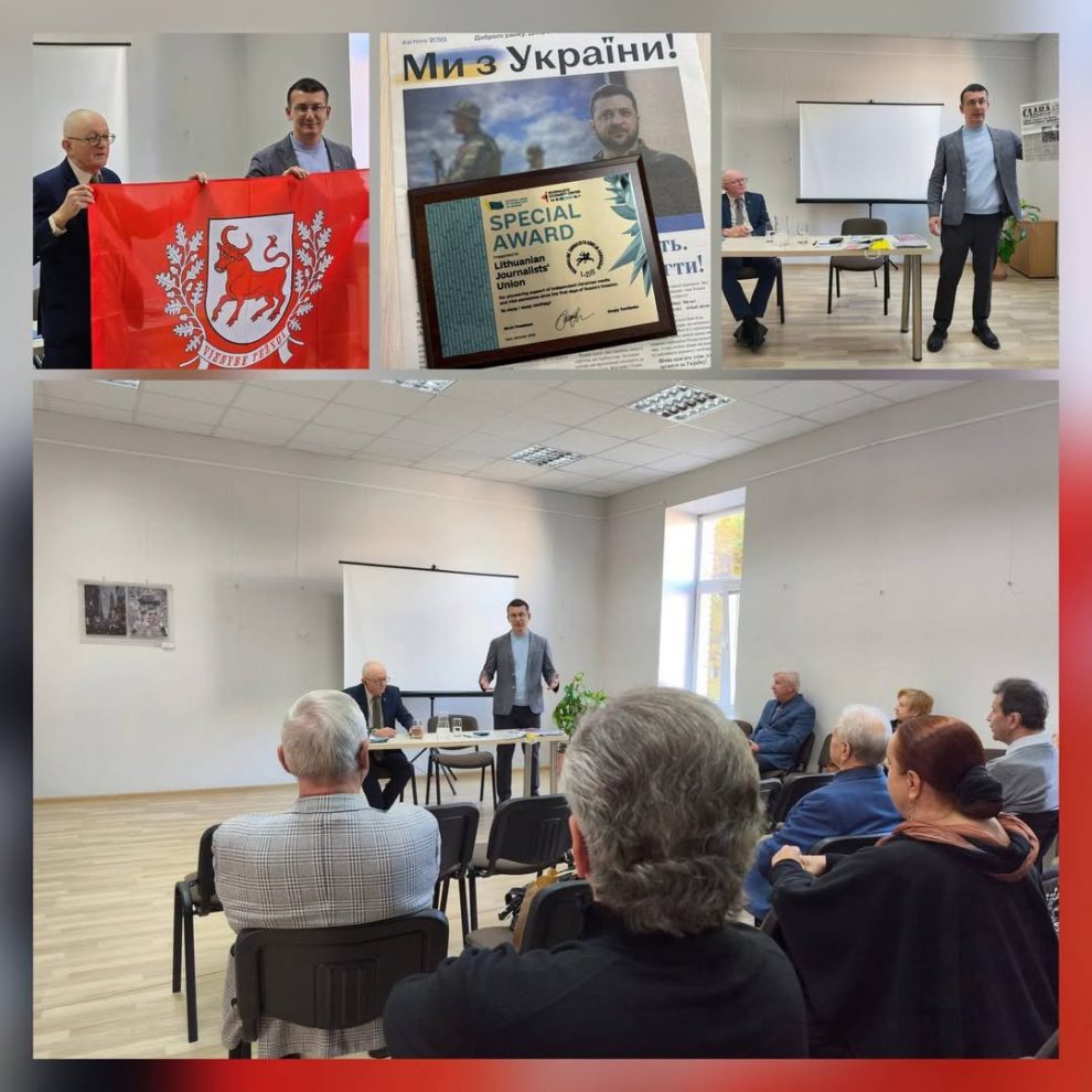 У Вільнюсі він вручив спеціальну відзнаку за дружбу та солідарність голові Литовської спілки журналістів Audrys Antanaitis та поспілкувався з активом спілки, розповів про виклики для українських журналістів, стійкість медійників та фронтову місцеву пресу.Почесним символом співпраці став прапор Сувалкійського регіону, який віднині займатиме місце в Центрі журналістської солідарності у Києві. «Цей прапор – символ литовського опору», – додав голова НСЖУ.