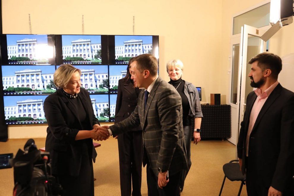 Учора, 15 грудня 2025 року, в межах відвідин Львівської політехніки заступником міністра освіти України Миколою Трофименком відбулася зустріч у Медіалабораторії кафедри журналістики та засобів масової комунікації Інституту права, психології та інноваційноі освіти.Про практичну підготовку майбутніх журналістів у Львівській політехніці розповіла завідувачка кафедри Зоряна Галаджун, яка наголосила, що формування професійних компетентностей розпочинається не з практики, а з навчальних лабораторій та студій, коли на заняттях кожен має змогу працювати з професійним телевізійним та радійним обладнанням, яким забезпечена кафедра.